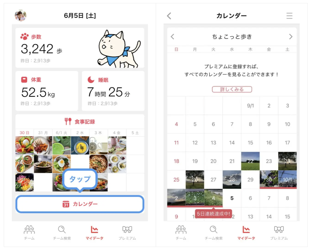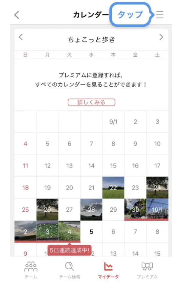 カレンダー機能では、参加中のチームのチャレンジ写真をカレンダー形式で見ることができます。