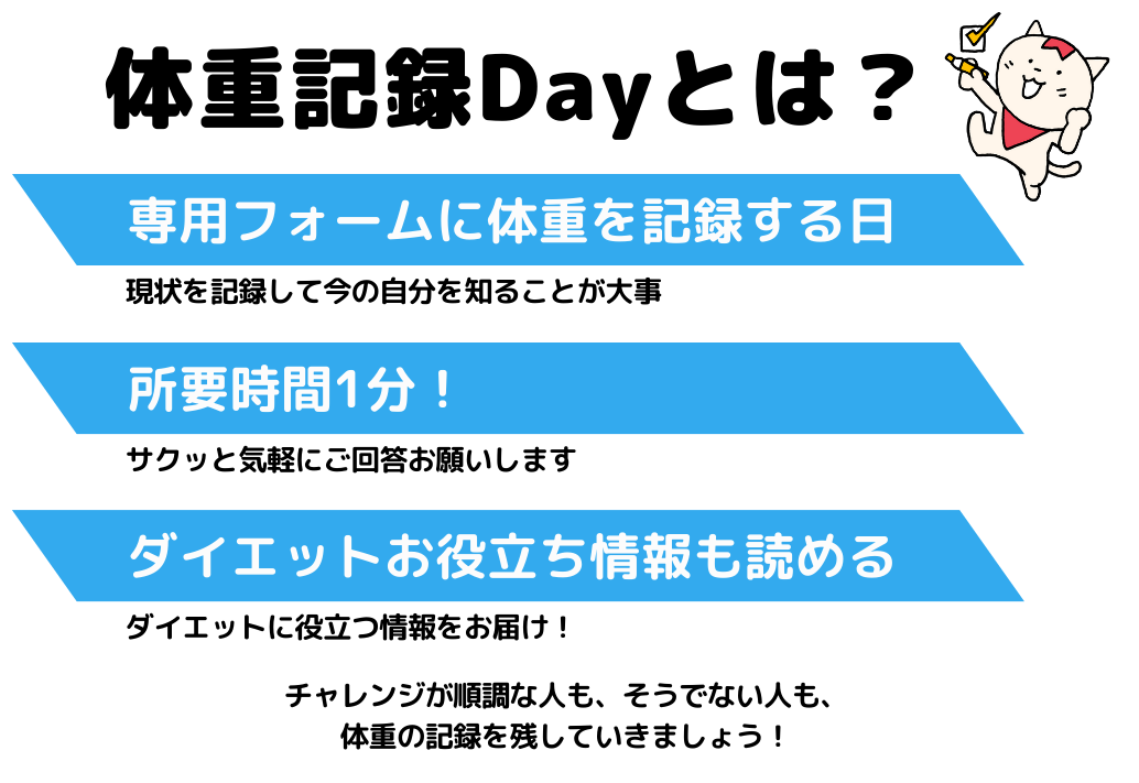 毎週金曜に、体重を測り、専用フォームに記録していただく日を設けており、「体重記録Day」と呼んでいます。